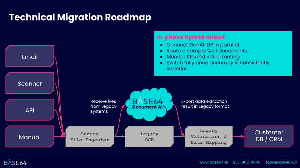 Base64 multi-modal AI ingests data from structured and unstructured documents, images, and multimedia in over 50 file formats with just one simple API call or hundreds of prebuilt no-code connectors to scanners, RPA platforms, and third-party software.
