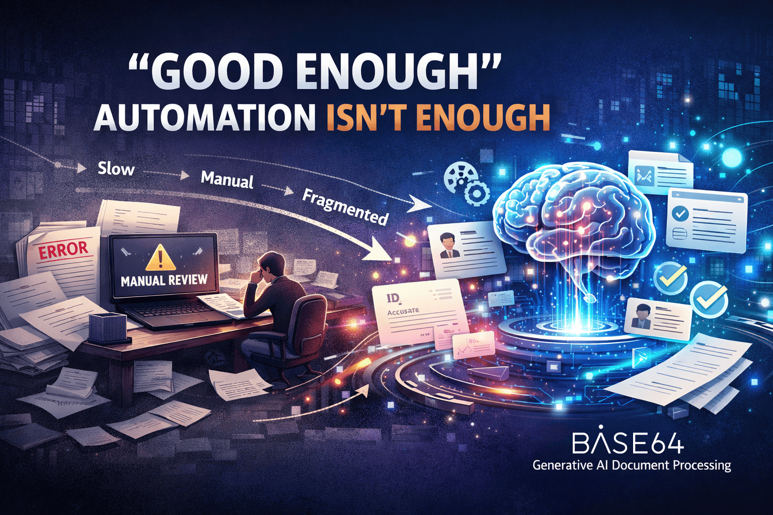 Eliminate manual document processing and outdated text extraction systems. Base64’s Document Intelligence Platform applies the latest AI technology to help your organization achieve new levels of efficiency, accuracy, and digital transformation.